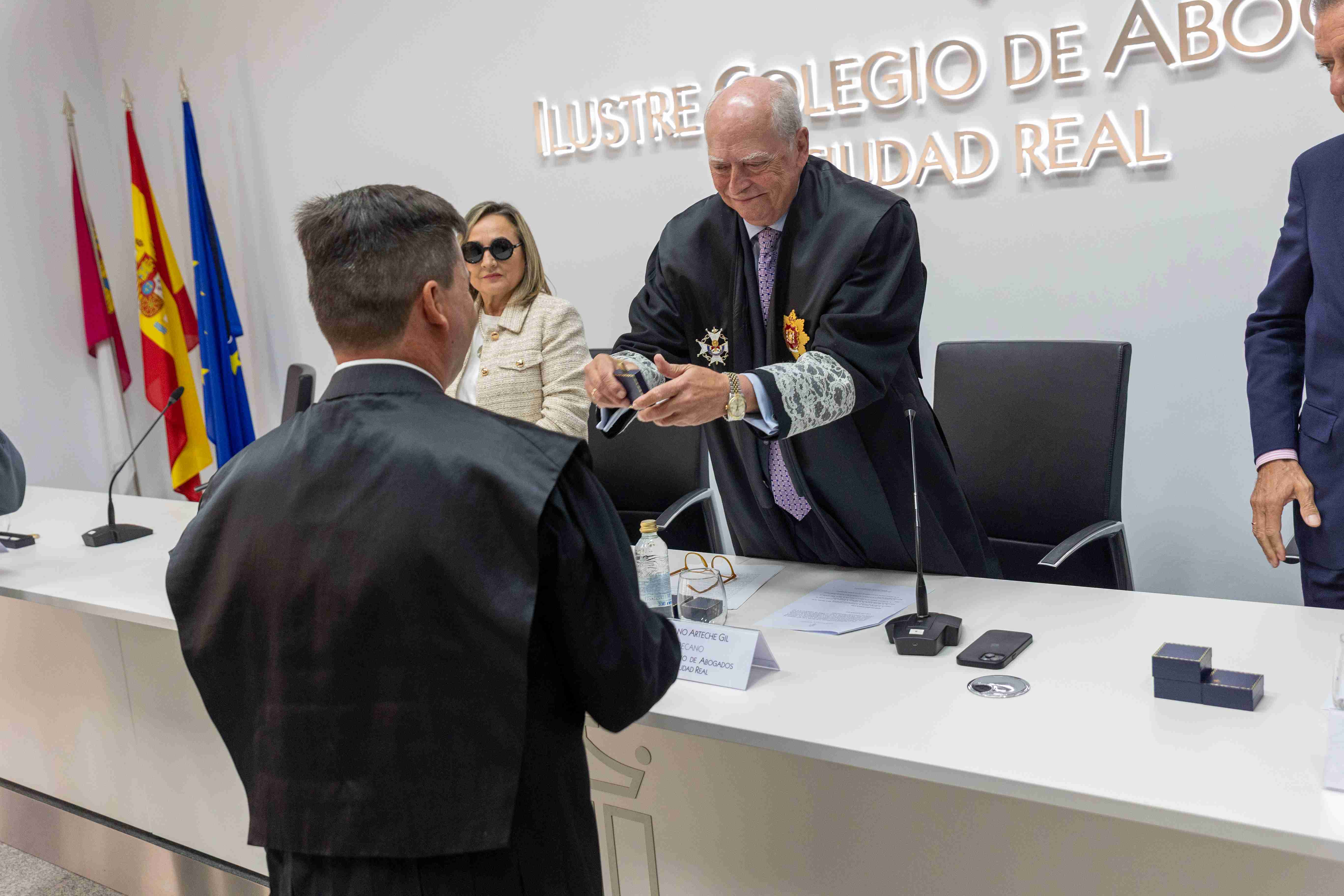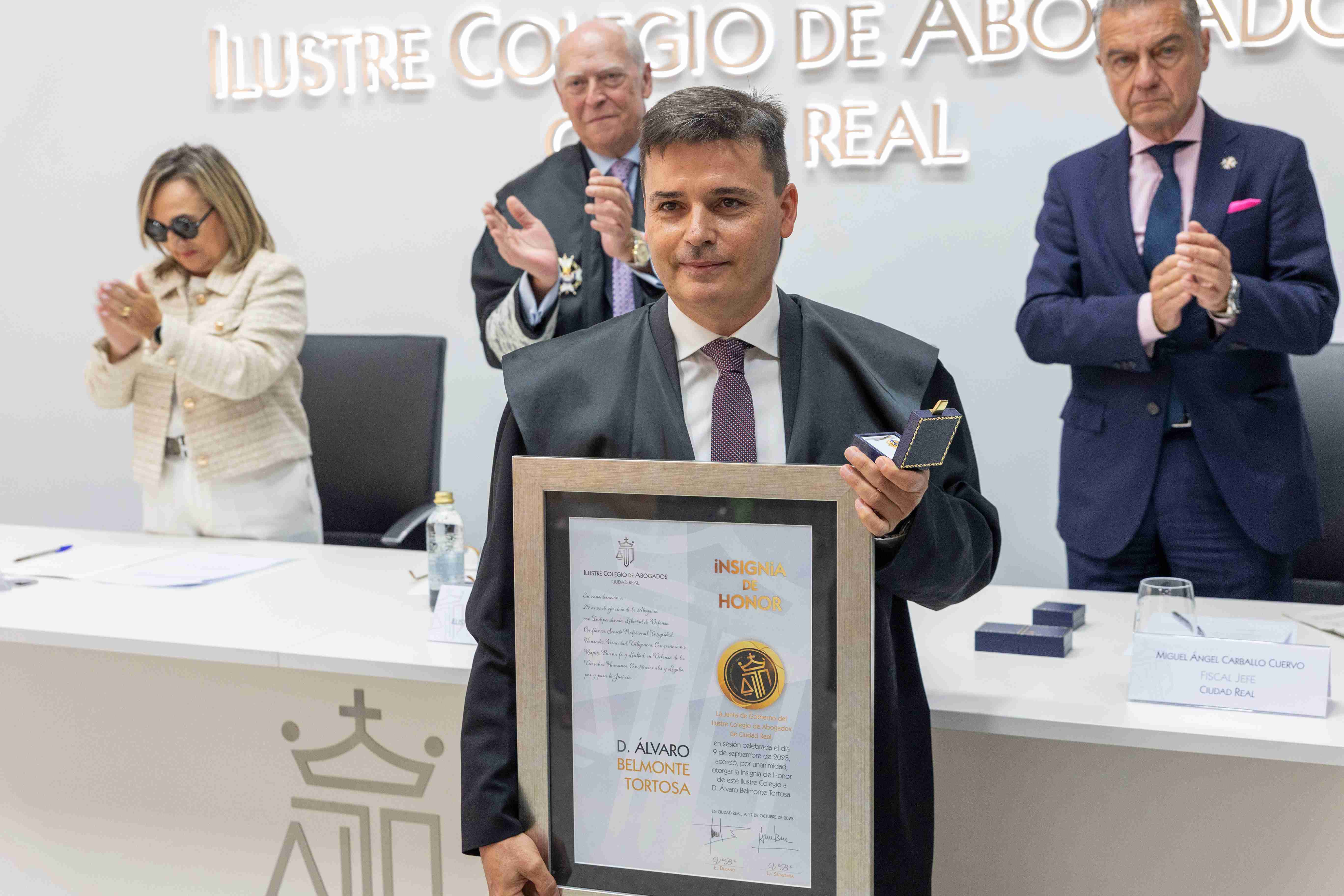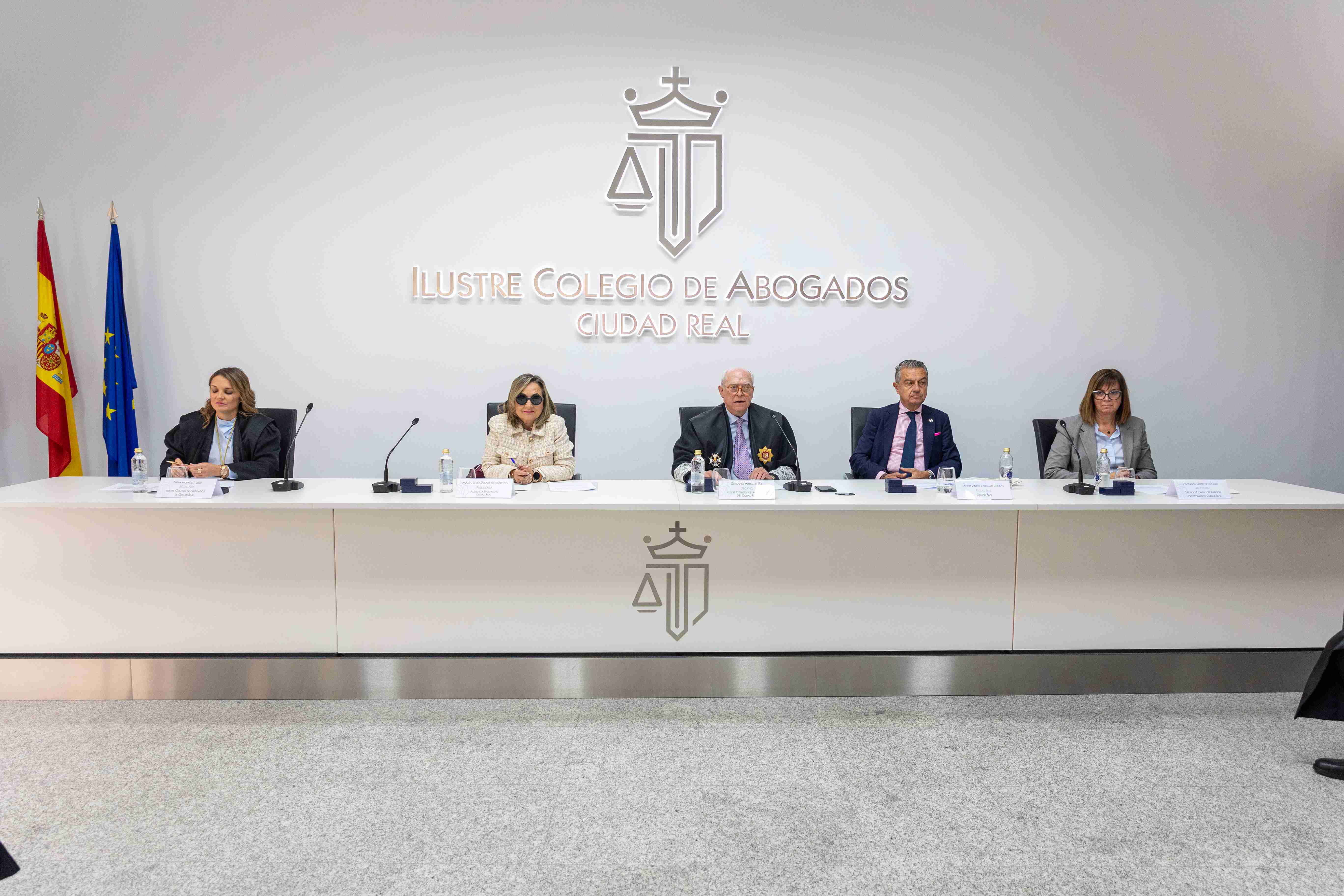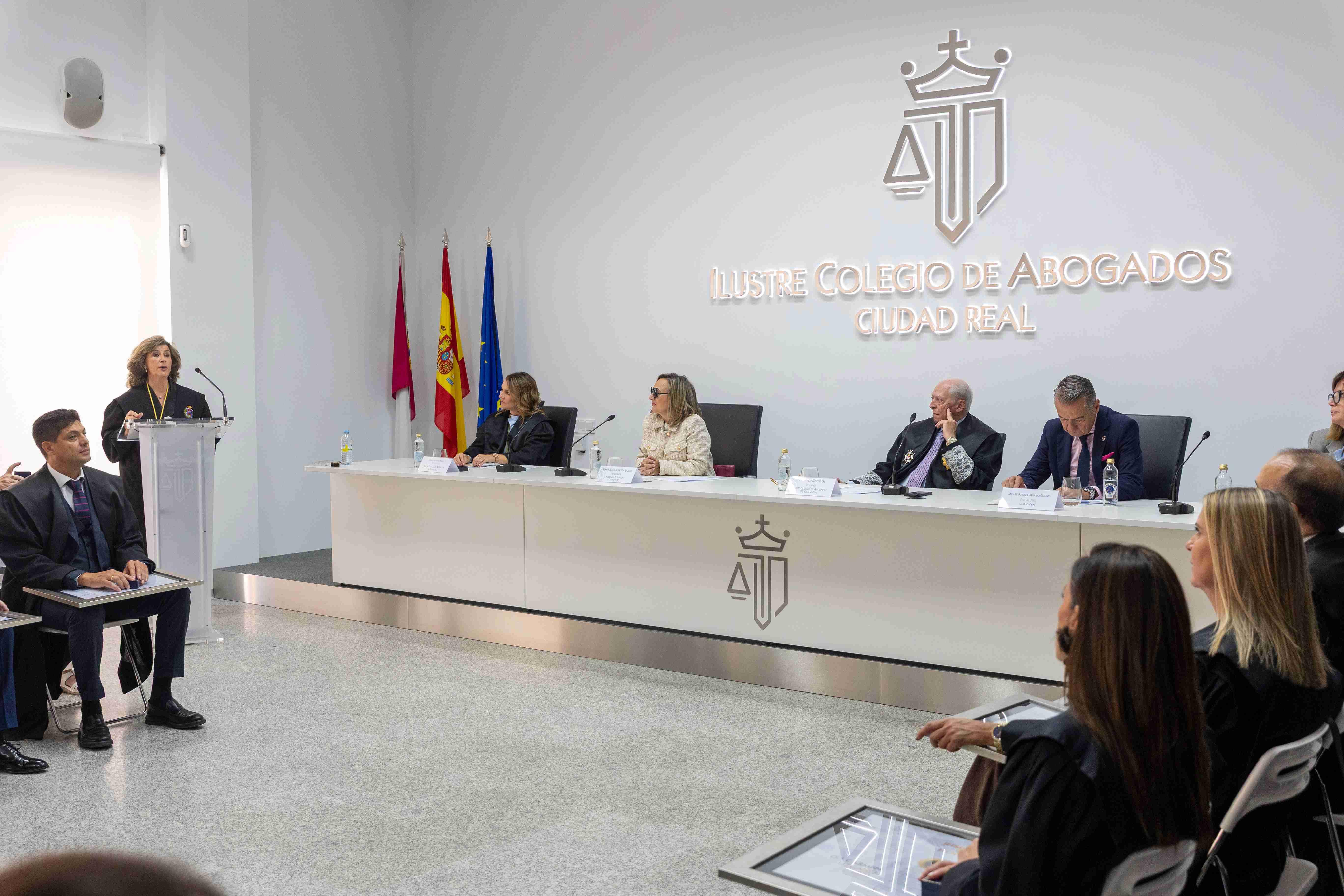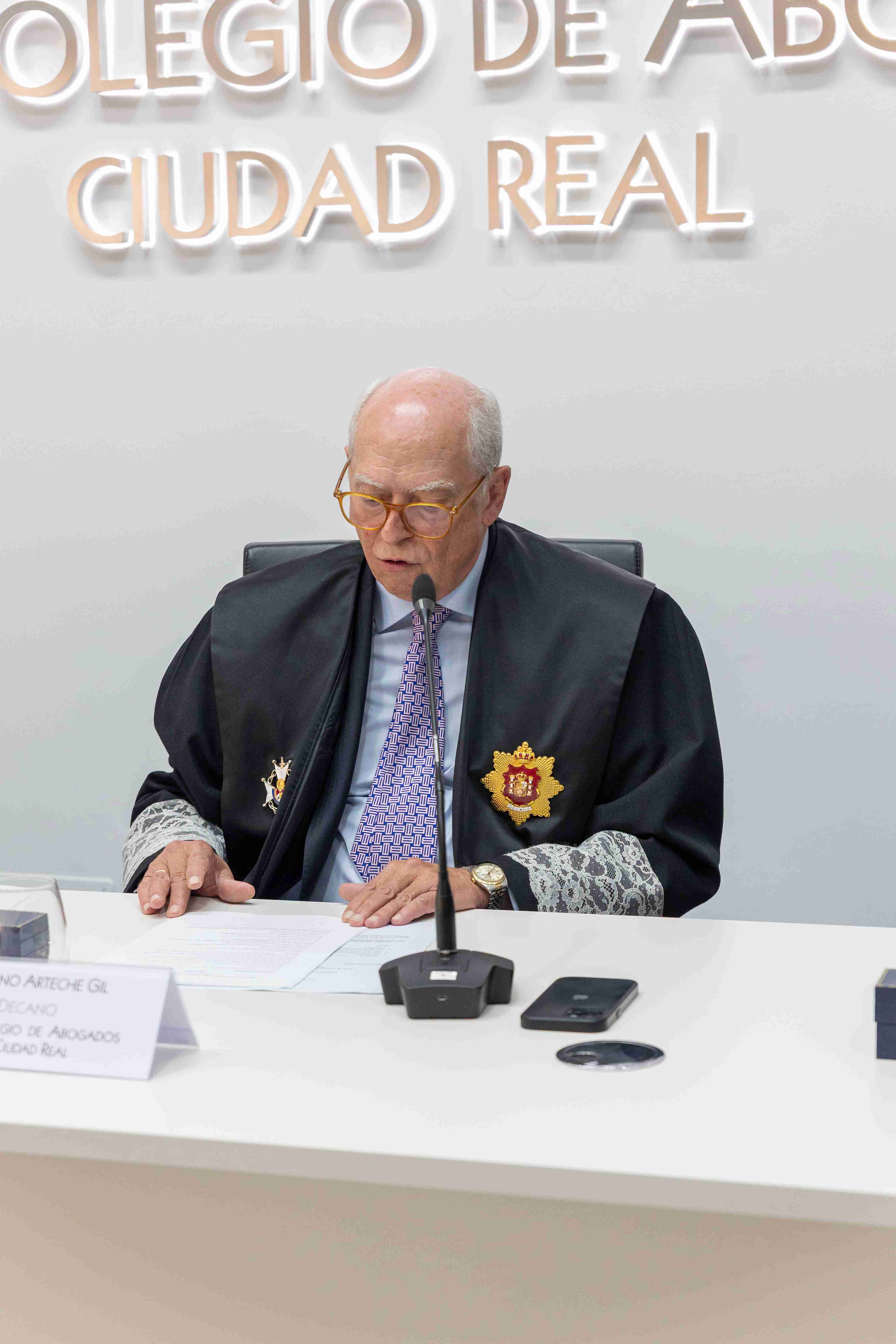 El Acto Institucional tuvo lugar en el salón de actos de la sede del Colegio, también el viernes 17 de octubre. En el mismo, se procederá a la entrega de la Insignia de Honor del Colegio a los compañeros y compañeras que en 2025 cumplen 25 años de ejercicio profesional. El acto estuvo presidido por el Decano, Cipriano Arteche; que estuvo acompañado en la mesa de presidencia por María Jesús Alarcón, Presidenta de la Audiencia Provincial; Miguel Ángel Carballo, Fiscal Jefe de Ciudad Real; Ascensión Prieto, Directora de Servicio Común del Procedimiento; y Diana Moyano, Secretaria del Ilustre Colegio de Abogados de Ciudad Real.